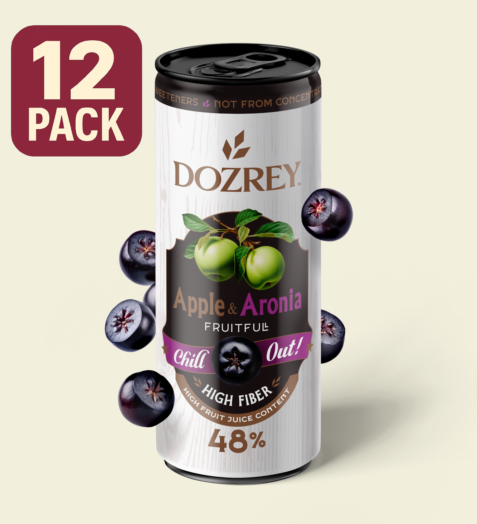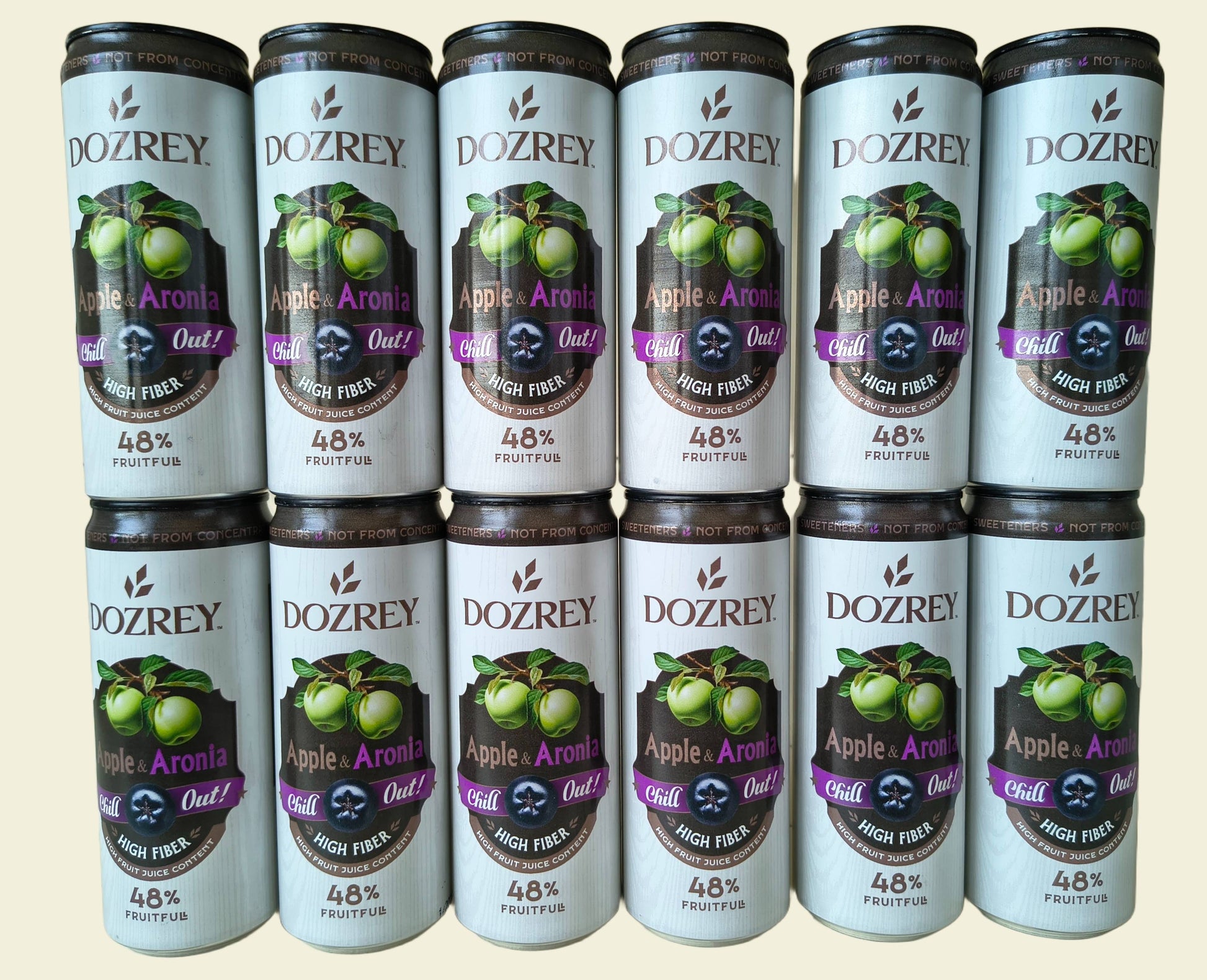 Balení obsahuje 12 plechovek o objemu 330 ml s příchutí jablka a aronie DOZREY.