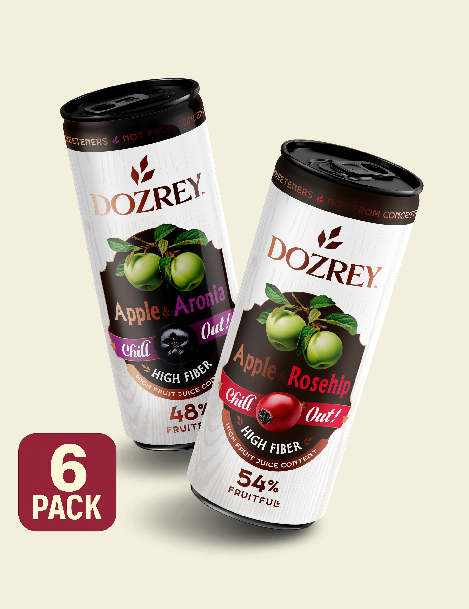 Objevte dokonalou rovnováhu mezi výrazným a zářivým s balením DOZREY Duo Pack, které obsahuje dvě přirozeně funkční příchutě: Jablko a aronie a Jablko a šípky . Každá z plechovek je vyrobena ze šťáv lisovaných za studena, nikoli z koncentrátu (NFC), a přináší osvěžující chuť a skutečné výhody – bez přidaného cukru, konzervantů a umělých sladidel.